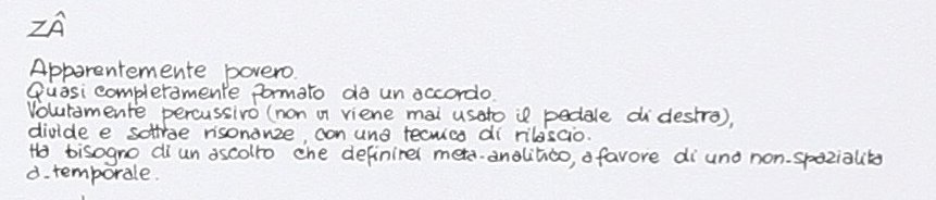 ‘Zâ’ consists of an insistently repeated piano chord, with slight variations, bringing the microtones of the notes to the fore. This piece marks the beginning of Battiato’s research into overtones, which I have written about extensively here. Probably inspired by his early experiments with the prepared piano in the style of John Cage, Franco tried out his own percussive “preparation” by using the piano’s pedal. On the back cover, he described the piece as “apparently poor, almost entirely composed of a single chord. Deliberately percussive (the right pedal is never used), it divides and subtracts resonances through a release technique [of the pedal].”
